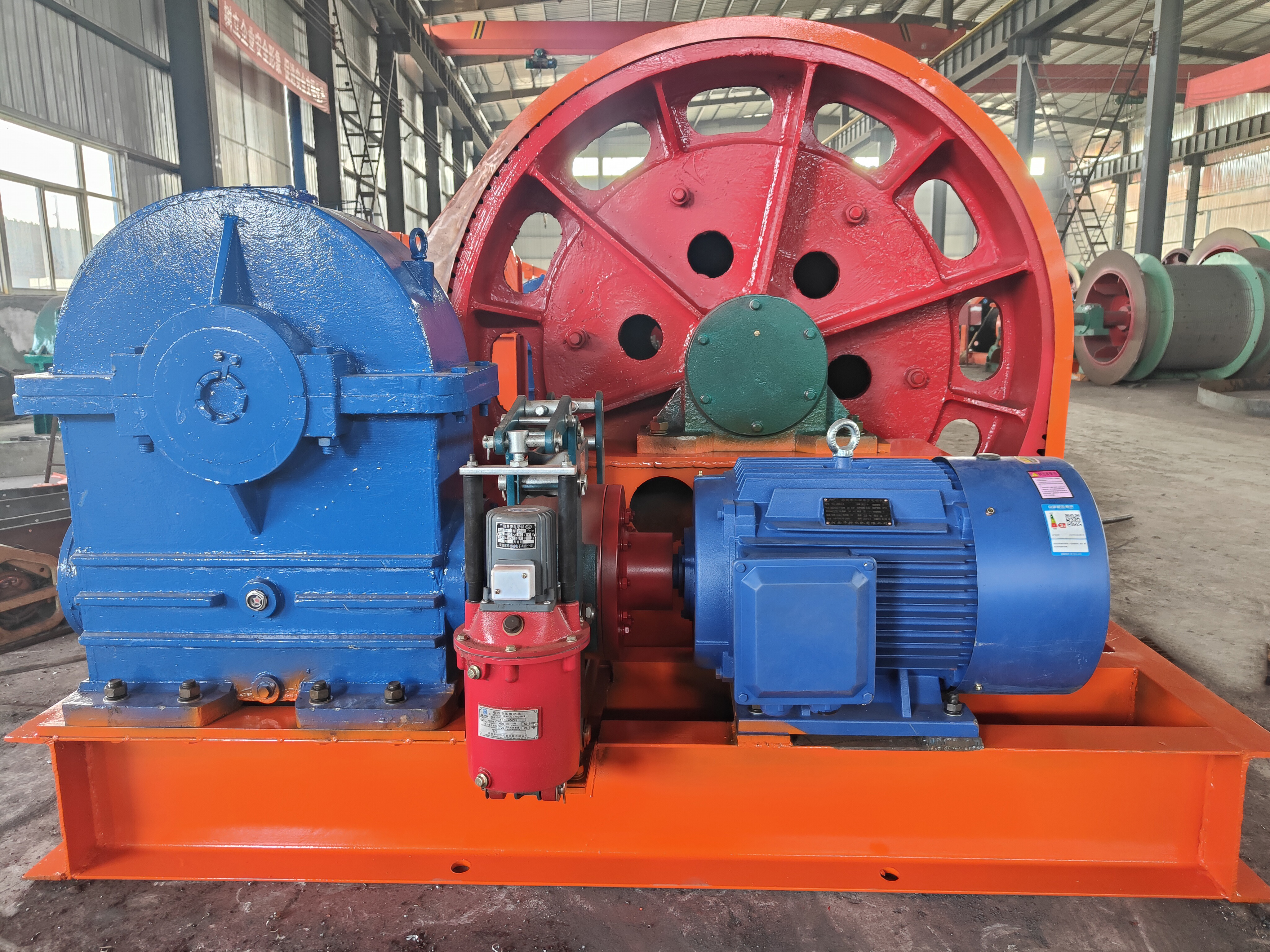 本絞車主要用于煤礦、金屬礦和非金屬礦豎井井筒掘進(jìn)時(shí)懸吊吊盤、水泵、水管、注漿泵、風(fēng)筒等掘進(jìn)設(shè)備和張緊穩(wěn)繩,該絞車系雙鋼絲繩懸吊。將減速機(jī)上的差動(dòng)手把放在差動(dòng)位置,若張緊穩(wěn)繩,可使兩根穩(wěn)繩的張緊力保持相等;若懸吊水管、注漿管、風(fēng)筒等管類設(shè)備,可保證其被懸吊管類設(shè)備與地面保持垂直的狀態(tài)。如果懸吊吊盤等盤狀設(shè)備,需將其差動(dòng)手把放在直通位置,才能實(shí)現(xiàn)兩繩繩速的一致。