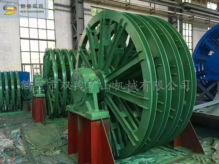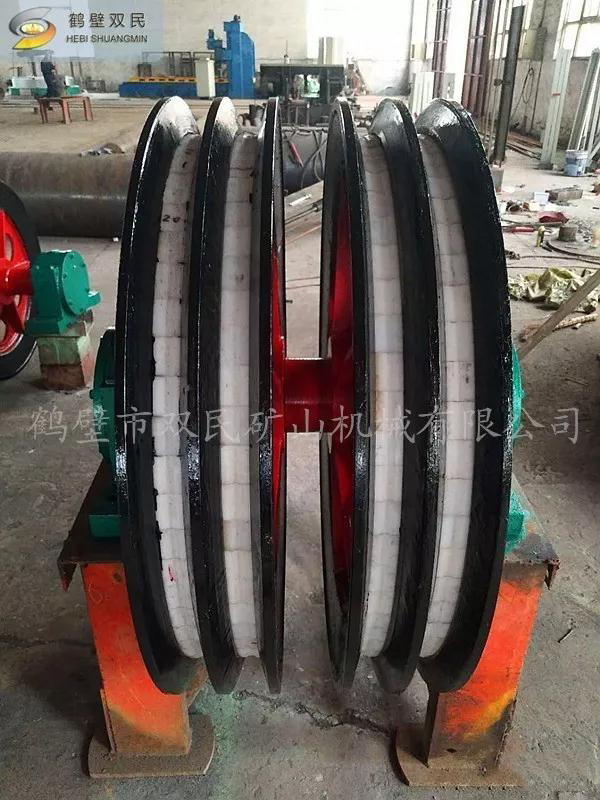 天輪由軸、天輪、滾動(dòng)軸承、軸承座等組成, 一個(gè)天輪固定在軸上,稱為固定天輪,其余天輪其輪轂內(nèi)嵌一個(gè)銅套,活裝在軸上,對軸可作相對轉(zhuǎn)動(dòng),以消除因各條提升鋼絲繩的速度差對天輪的滑動(dòng)摩擦。
